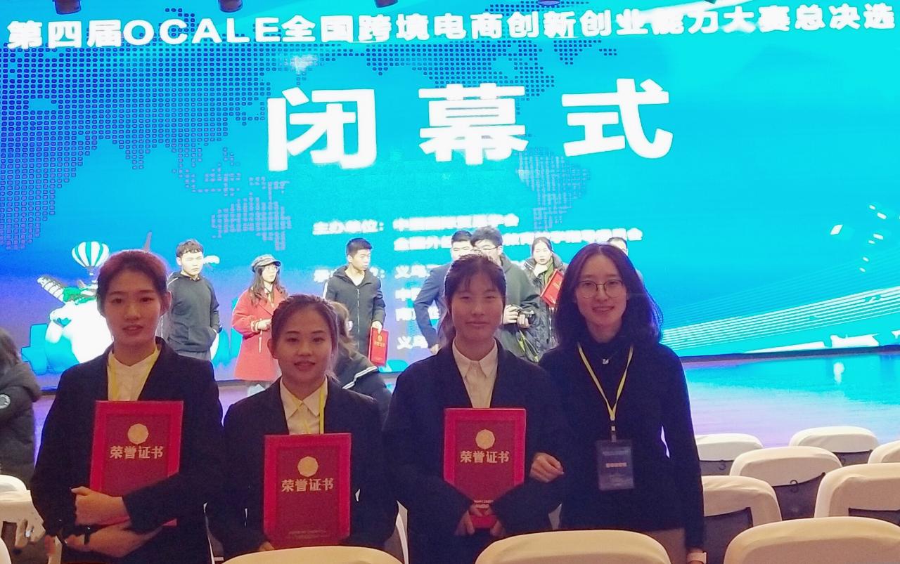 12月18-19日,由中国国际贸易学会和全国外经贸职业教育教学指导委员会共同主办的2019年第四届OCALE全国跨境电商创新创业能力大赛总决赛在浙江义乌圆满结束,我系2018级电子商务专业张薇薇、朱慧、王婷婷组成的代表队荣获一等奖。